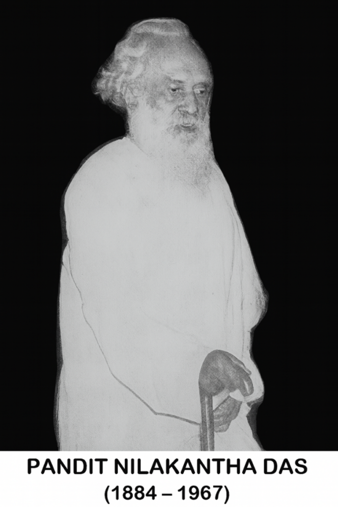Pandit Nilakantha Das, the famous headmaster of the Satyabadi School at the dawn of the 20th Century Odisha, was a revered figure in pre-independence Odisha and across India. He is widely regarded as one of the brightest minds of his time (>> Link). Due to his exceptional intellect and profound knowledge in many important fields, he was honoured as Utkal Guru by Netaji Subhas Chandra Bose, in 1939, and more formally by Pandit Godabarish Misra and others, in 1951. (>> Link Dr. Digaraj Brahma, pg. 47). In knowledge, temperament, lifestyle and appearance, Pandit Nilakantha’s resembled the ancient Indian rishis. His expertise in Sanskrit, and pioneering research on the Odia language and Jagannath culture have no parallel. His unique personality, immense erudition and intellectual independence were evident in every aspect of his life.