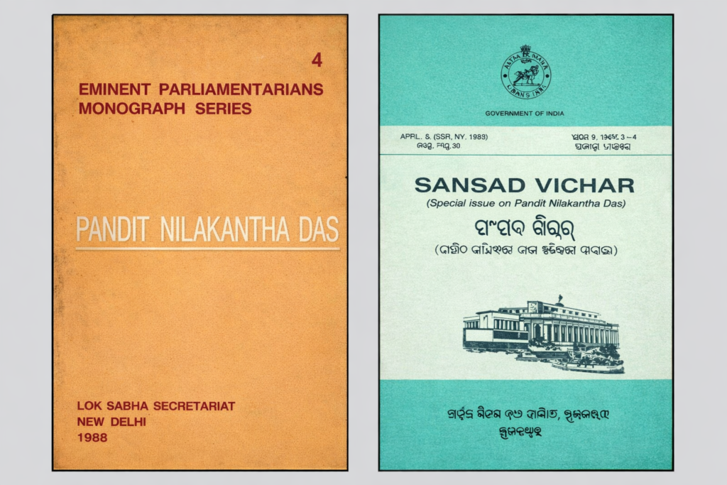 In Odisha, Nilakantha played a key role in merging Ganjam, Koraput, and Paralakhemundi with the newly formed province in 1936.  As a member of the Odisha Assembly from 1952, he worked to ensure the independence of the Speaker’s office as is guaranteed under the Indian Constitution. He was regarded as one of the great Parliamentarians of the time, both in India and in Odisha. Some of his important arguments and speeches on the Parliament floor are available under the Eminent Parliamentarians Series (Volume 4, 1980), a publication by the Delhi Central Assembly, and as a special edition called Sansad Vichar (1991) by the Odisha Assembly.
