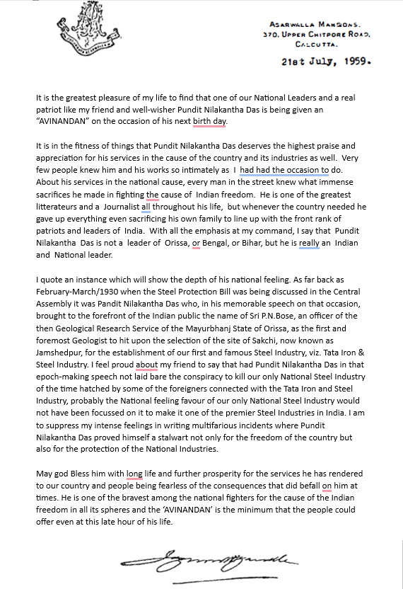 This letter, written in July 1959 by a leading Indian industrialist from Calcutta, was addressed on the occasion of Pandit Nilakantha Das being formally honoured with an Avinandan for his 75th birthday. The author records Nilakantha Das’s extraordinary role as a parliamentarian and a national leader,  whose work extended far beyond regional or provincial boundaries. In particular, the letter highlights Nilakantha Das’s intervention when efforts were being made by the British Government to import steel to